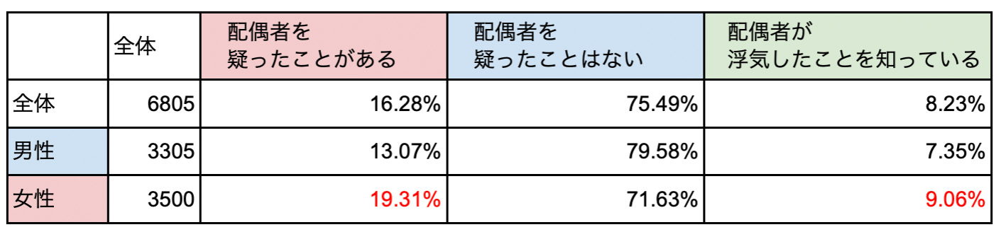 男女比較すると女性のほうが「疑ったことがある」「浮気したことを知っている」と回答する人が多い結果になった。