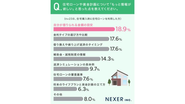 住宅ローンや資金計画について「もっと情報が欲しい」と思った点を尋ねたところ、「自分が借りられる金額の目安」という回答が18.9%で最多となり、以下、「金利タイプの選び方や比較」と「借り換えや繰り上げ返済のタイミング」(各17.6%)、「補助金・減税制度の情報」(14.3%)と続いた。