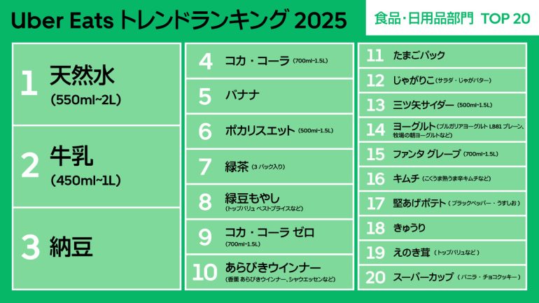 さらに、トイレットペーパーやティッシュペーパーなど、かさばる日用品も上位にランクイン。Uber Eatsが「食」にとどまらず、日常の緊急対応や即時ニーズを支えるインフラ的な役割を果たしていることがうかがえる。