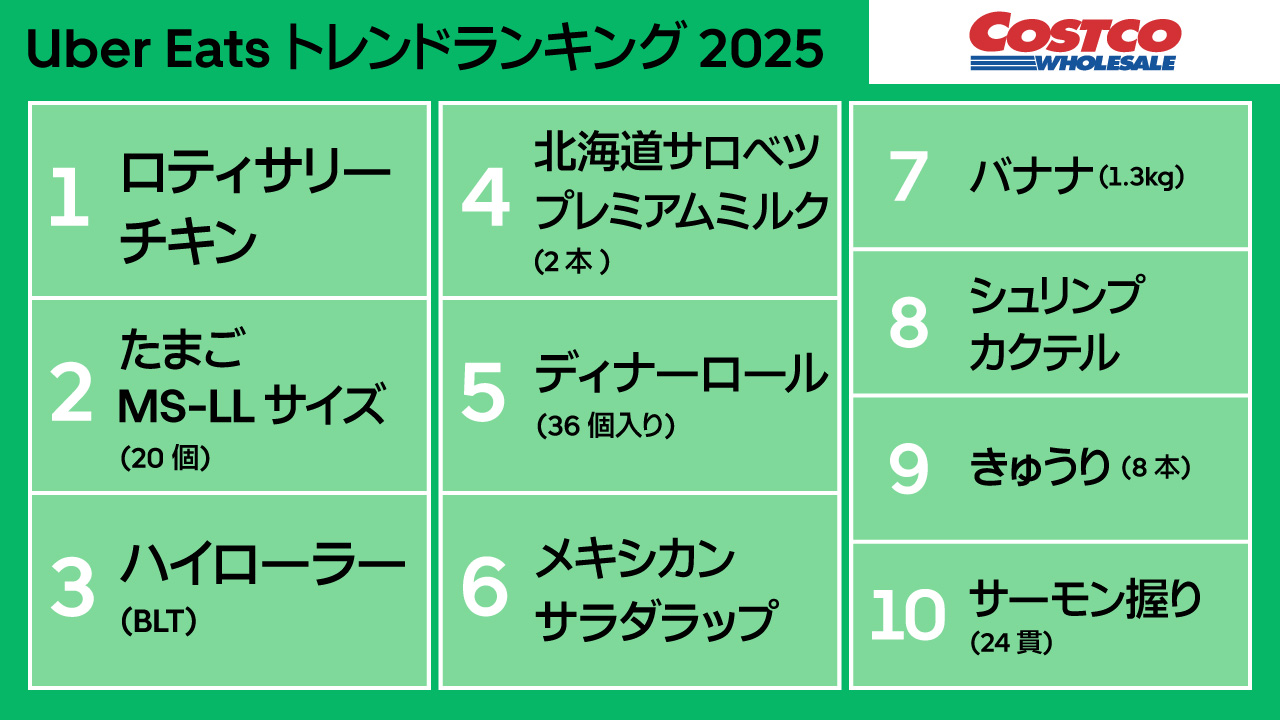 さらに、Uber Eatsで注文可能なコストコ商品の人気動向や、年間を通して最も注文された商品など、2025年の食トレンドを象徴する結果も紹介している。