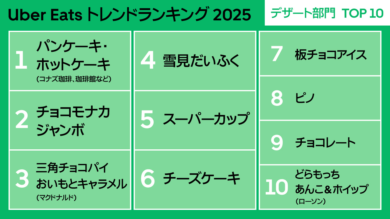 デザート部門では、上位の多くをコンビニ定番のアイスクリームが占める結果となった。「特別なスイーツ」よりも「気軽に楽しめる小さなご褒美」が選ばれており、Uber Eatsを通じてコンビニスイーツを自宅で楽しむスタイルが定着していることがうかがえる。