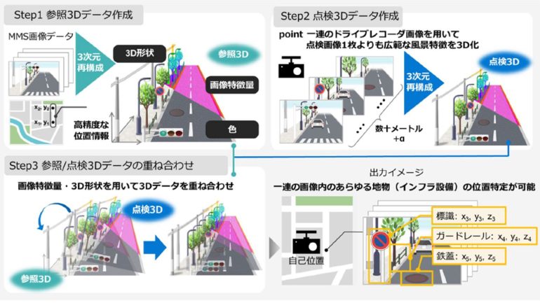 これにより、ドライブレコーダ点検画像に、高精度なインフラ設備位置情報を紐づけることが可能になる。