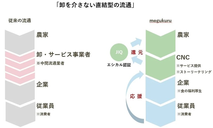 もともとJIQは日本の地域産業の活性化や、農家など一次産業と企業を連携させた創業を支援してきた。今回JIQはネスレと連携したカフェ事業やフードサービスを展開するCNCへ環境や働く人に配慮した優良農家をつなぎ、CNCは旬の野菜やフルーツ、鶏卵などの農作物を地域農家から直接定期的に買い取ってCNCが持つセントラルキッチンで調理・パック詰めしてオフィスに届ける。