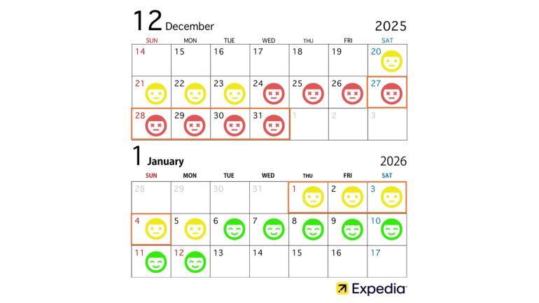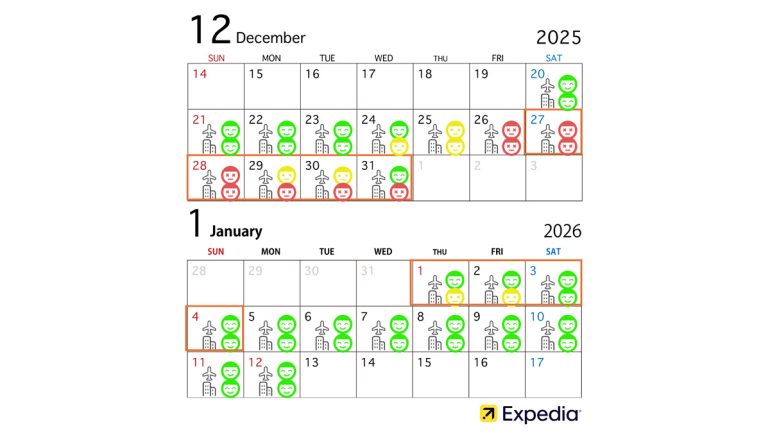 混雑を避けるための出発日を選ぶことは重要だが、旅費を抑えるための日程選びも大切だ。エクスペディアの昨年末の1泊あたりの平均宿泊費と平均航空券代のデータをもとに予測すると、12月下旬から費用が高くなる傾向にあり、クリスマス付近から年末にかけて費用が最も高くなる見込みだ。