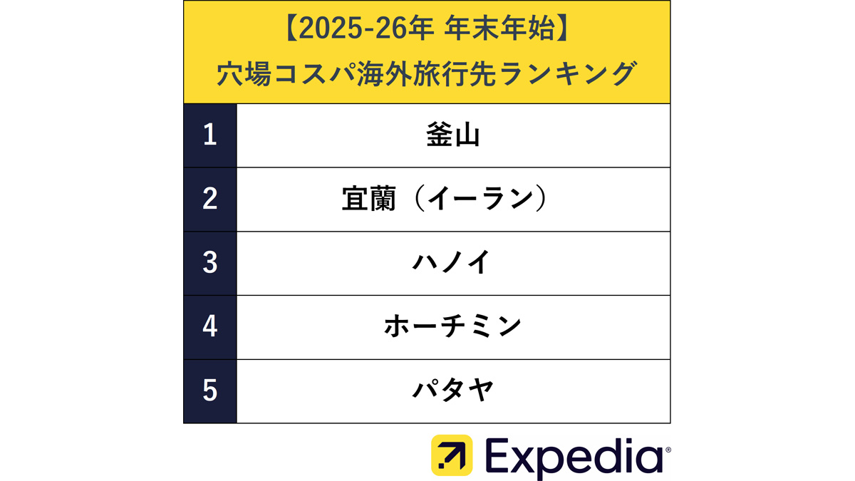 エクスペディアではこのほど、こうしたお得に海外旅行を楽しみたい人にうれしい2025年~2026年の年末年始における「穴場コスパ海外旅行先ランキング」を、「人気海外旅行先ランキング」「フライトとホテルの混雑日やお得な出発日予想」とともに発表した。
