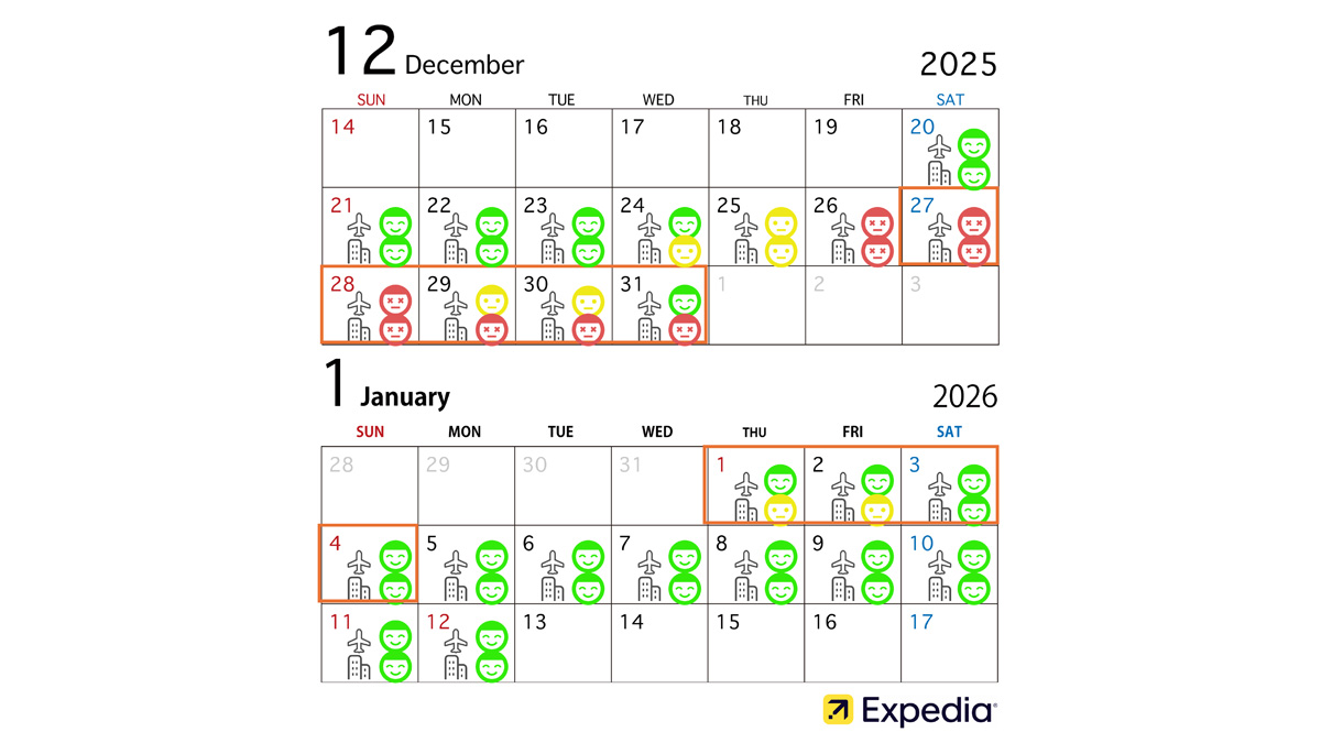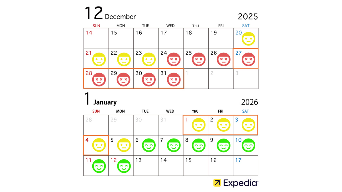 混雑を避けるための出発日を選ぶことは重要だが、旅費を抑えるための日程選びも大切だ。エクスペディアの昨年末の1泊あたりの平均宿泊費と平均航空券代のデータをもとに予測すると、12月下旬から費用が高くなる傾向にあり、クリスマス付近から年末にかけて費用が最も高くなる見込みだ。