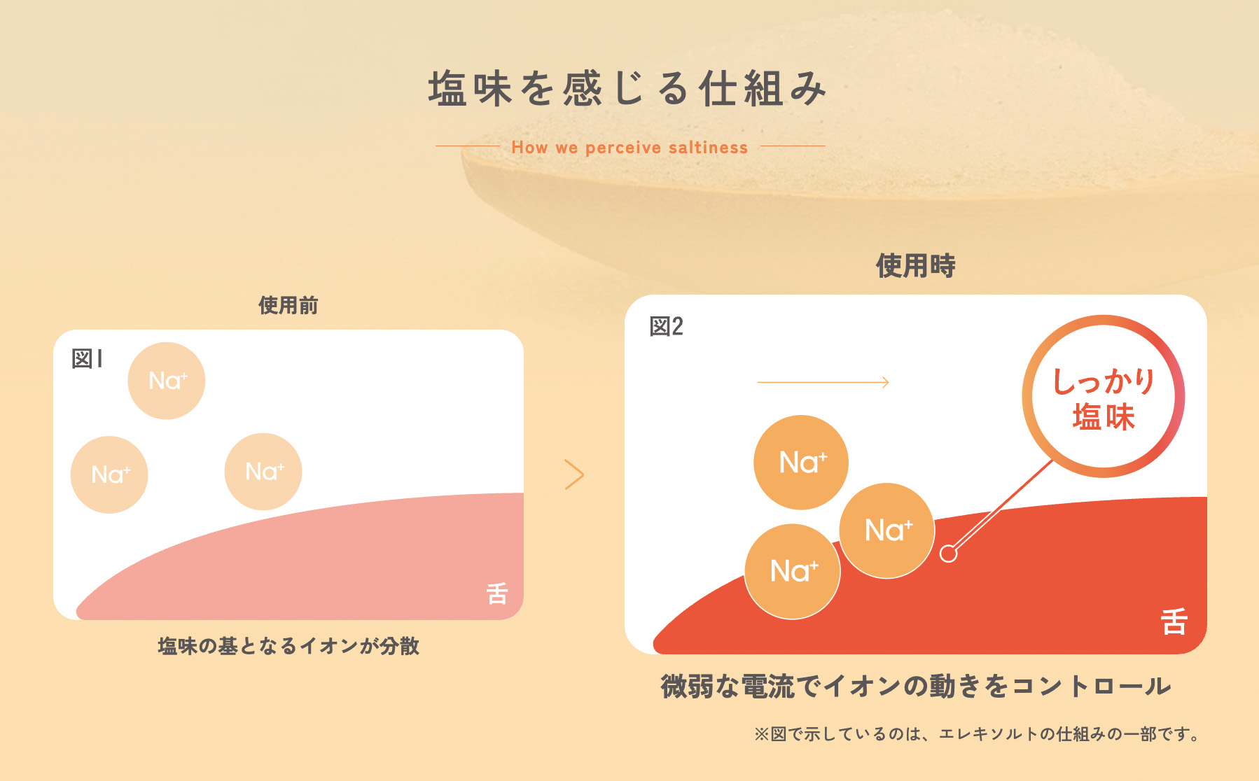 通常の食事(エレキソルトを使用しない食事)の場合、塩味の基となるナトリウムイオンは、口の中で分散しているため、舌に味として知覚されないものもあるという。エレキソルトは、食品を介して微弱な電流を舌周辺に流すことで、分散してしまいがちなナトリウムイオンを舌の方に引き寄せる。これにより、食事の塩味を増強する(※)ことができるのだ。