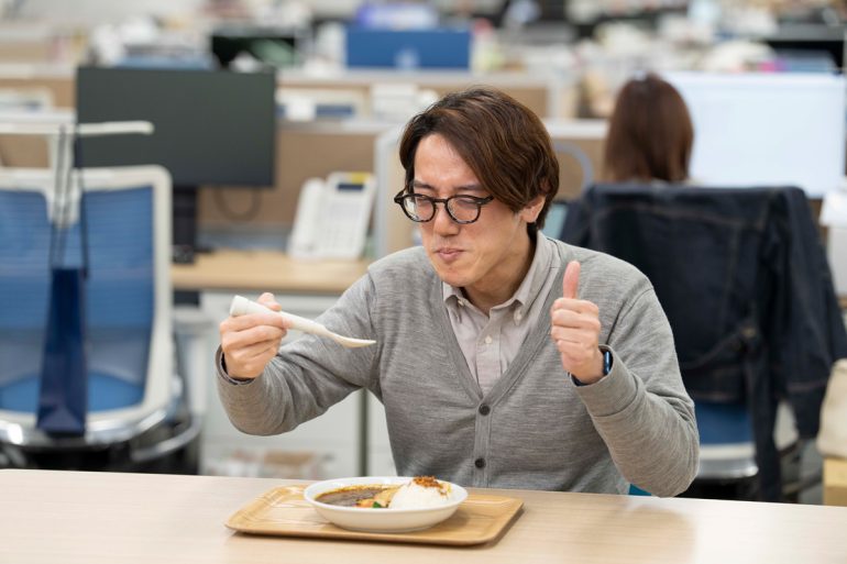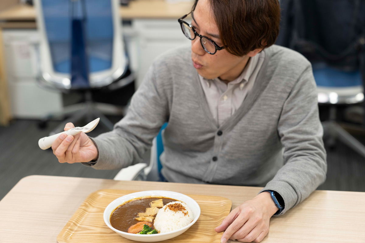 「電流が走る(※)ということなので、ピリピリしないのか気になっていたんです(笑)普通のスプーンと一緒ですね! うま味や塩味だけではなく、スパイスも含めたすべての味をしっかりと感じる気がします。日頃食べているカレーと比べても満足度は変わらないです。家族で使うことを想像したのですが、普通のスプーンを使って食べたときと、使わず食べたときの違いを話す……みたいなシーンも想像して、食事に関する話題が増える気もしました」