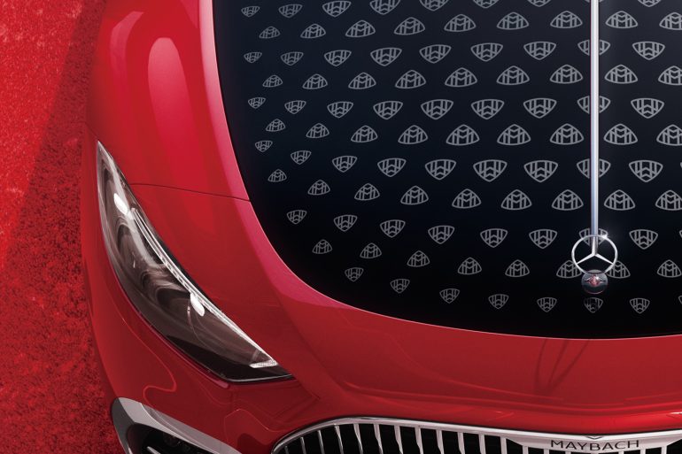 さらにエクスクルーシブ性を高める有償オプションとなるMAYBACHロゴ入りボンネットも選択可能。「オブシディアンブラック(メタリック)」のボンネットに「グラファイトグレー」 のマイバッハパターンを施したこのプリントボンネットには、非常に複雑な製造工程を要し、一部の作業は職人の手作業で行われる。また、工程の各段階において複雑な技術的要件を満たす必要があり、最高水準の精度が要求される。