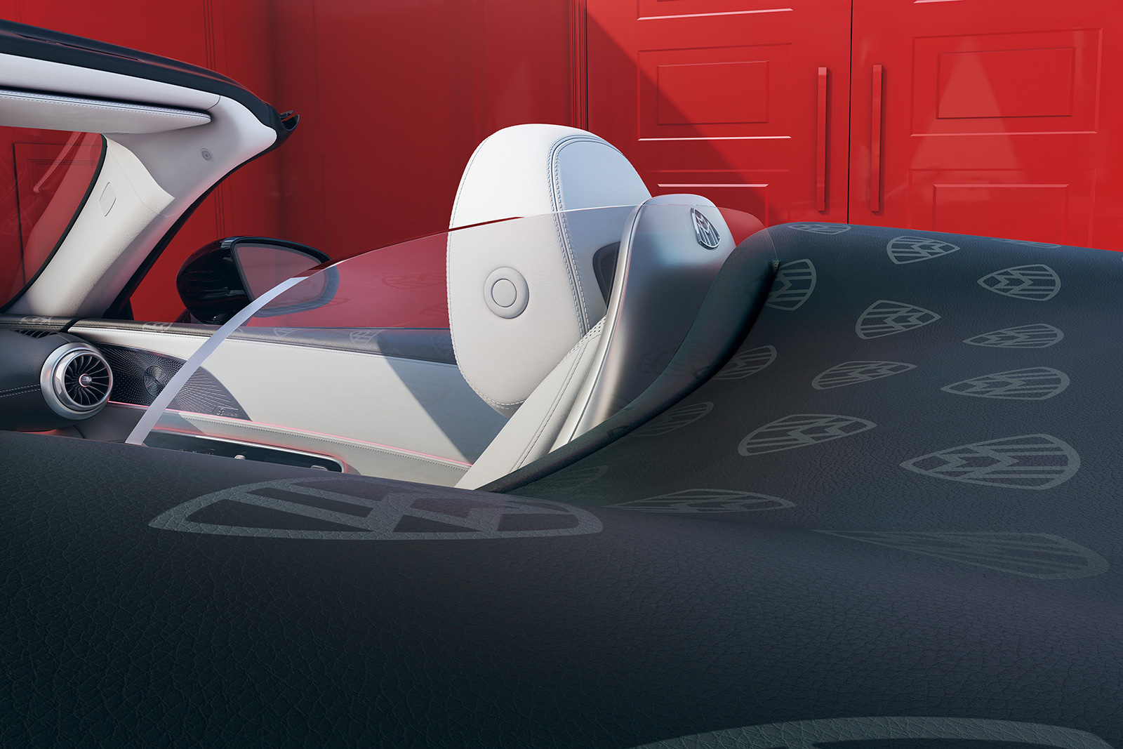 そして美しさとスポーティさが融合したマイバッハSLの魅力を表現するために、厳選された 2つのデザインコンセプトが採用された。「レッドアンビエンス」は、外装色に「MANUFAKTURガーネットレッド(メタリック)」を採用し、内装色の「MANUFAKTURクリスタルホワイト(ナッパレザー)」とのエレガントなコントラストを生み出している。