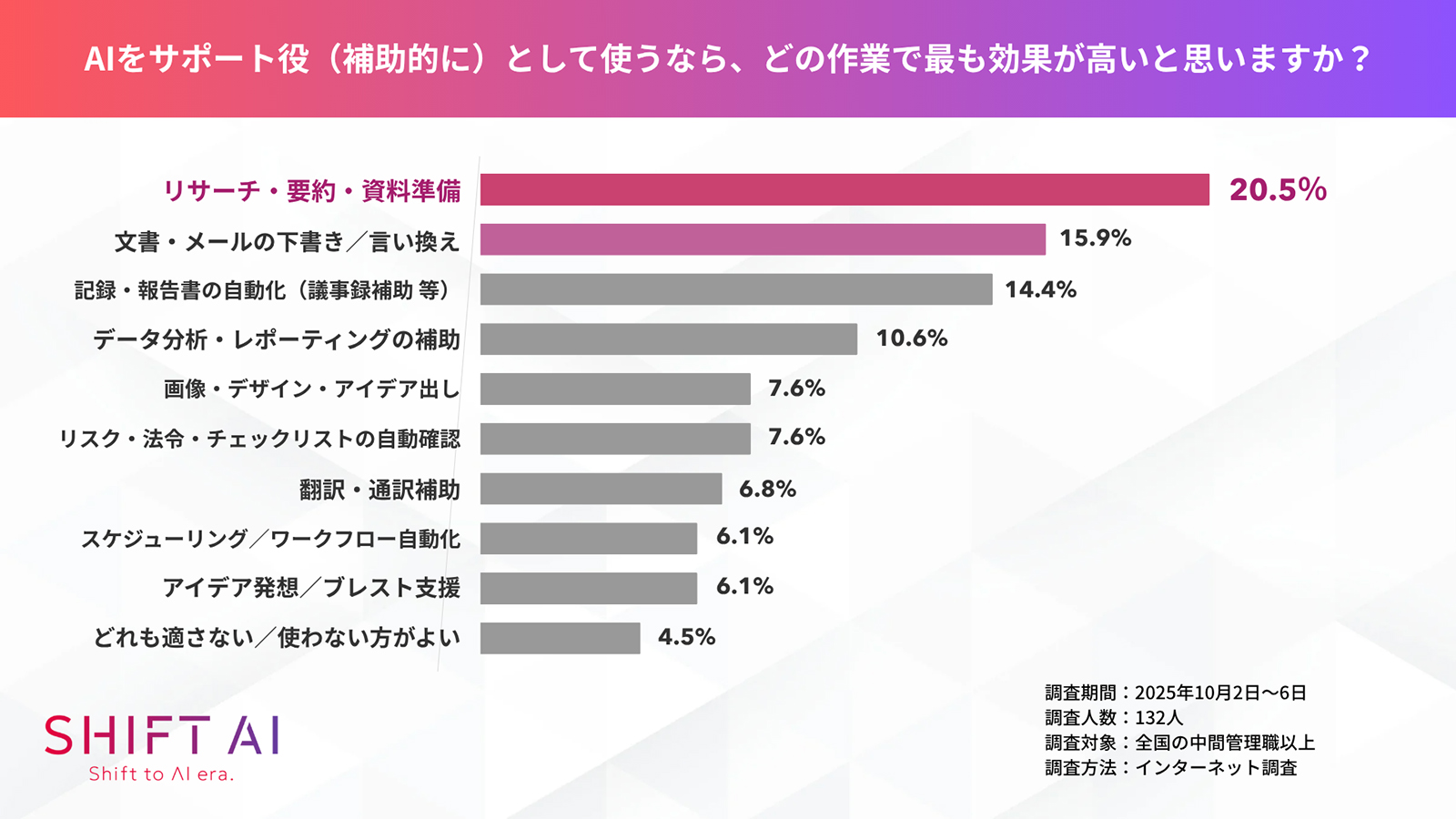 AIのビジネス活⽤を学べるAI⼤学『SHIFT AI』を運営するSHIFT AIは、全国132⼈の中間管理職以上を対象に「AI時代に『奪われにくい』職種と、その理由」について調査して結果を公開した。