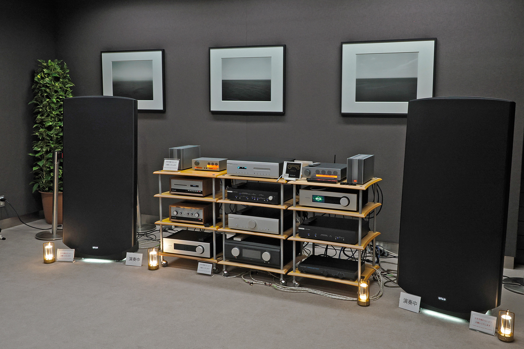 英国の伝統ブランドQUADは、プリ・パワー構成の33プリと303パワーが57年ぶりに復刻された。デザインは、ほぼ当時のままで入出力端子はRCAとXLRに変更され、一般的なオーディオ機器との互換性が向上している。バス、チルト、バランスコントロールも音質を損なわない仕組みで搭載され、ボリュームはアルプス製のモーターライズモデルを搭載、リモコンにも対応。パワーアンプはシンメトリカル・トリプル出力段を新採用した。創業以来の理念「The closest approach to the original sound」を現代技術で再解釈し、音楽の自然な流れと立体感を見事に再現。クラシックファンには特に刺さるブースであった。