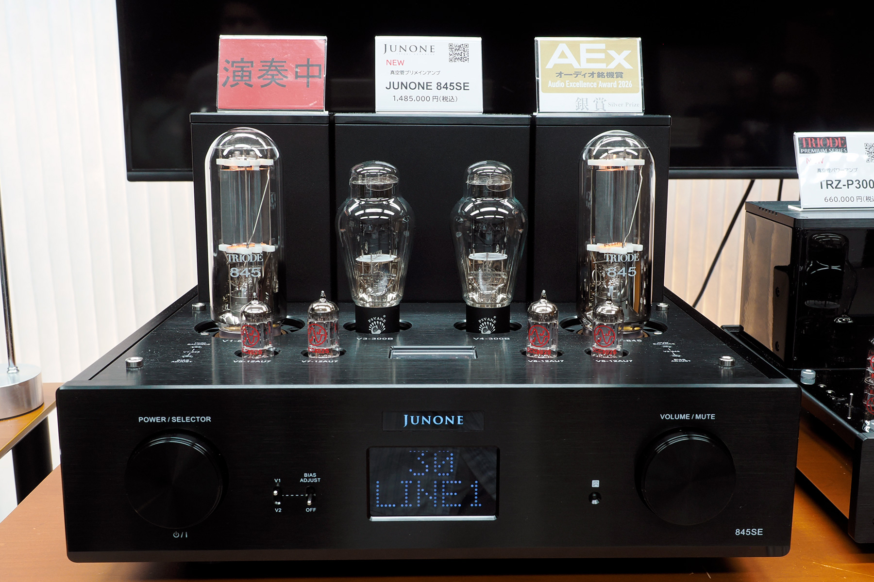 「JUNONE 845SE」は148万5000円。入力切り替え付きのプリメインアンプで、電子ボリュームを採用してリモコン操作にも対応する。固定バイアス方式を採用し、バイアスメーターを搭載する