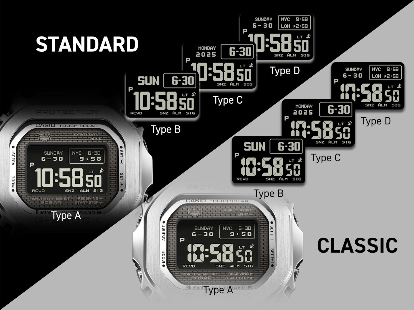 スマートフォンとの連携により、アプリ上で2種類のフォントを用意し、標準フォント「STANDARD」に加えて初代“G-SHOCK”から続く7セグメント表示のフォント「CLASSIC」にも対応するなど、好みに合わせた時間表示を選択できる。