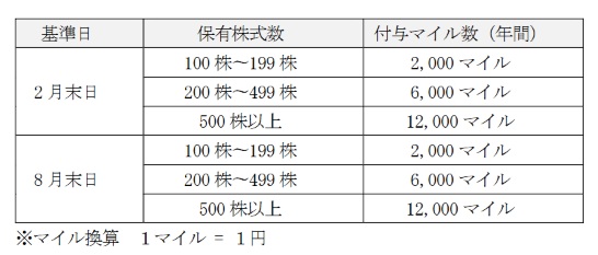 このマイル、気をつけなくてはいけないのは、株主優待の初回は2026年2月だが、条件があり、100株以上を継続して6ヶ月以上保有が必要なことで、2026年2月権利のためには2025年8月から保有が条件。今から買うなら、2026年2月と8月に同一株主番号で欲しいマイル分の株数をそれぞれ保有していれば2026年8月権利から株主優待をもらえる。