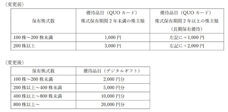 また、これまでなかった400株では1万円分のデジタルギフト、800株では2万円分のデジタルギフトが受け取れる。しかも現在、年間配当は4%超えでもある高配当。配当性向が74.5%と高いことが気になるが、高配当銘柄で、しかも株主優待拡充ということもあり、注目が集まりそうだ。