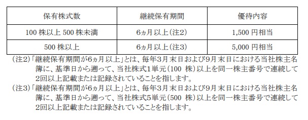 初回、2026年3月では継続保有期間に関わらず株主優待を受け取れるが、2027年3月からは6ヶ月以上の継続保有が必要。もし、2026年3月末の後、売ってしまうこともできるが、買い戻して2026年9月末の権利、2027年3月の権利には同一株主番号で必要株数を保有する必要がある。