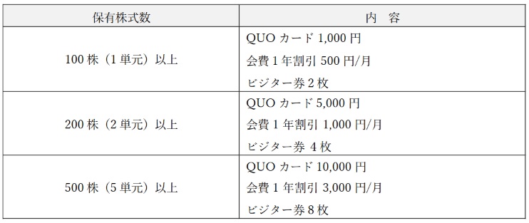 フィットネスクラブを無料体験したい時に使える株主優待もある。それがフィットイージーの株主優待だ。10月24日に株主優待制度の詳細決定が発表され、毎年10月が権利月。今から買うとなると来年の10月権利まで待つことになるが、株主優待内容を金額換算するとお得度がすごい。100株保有するとQUOカード1,000円、会費1年割引(1ヶ月あたり500円)、ビジター券2枚がもらえるからだ。