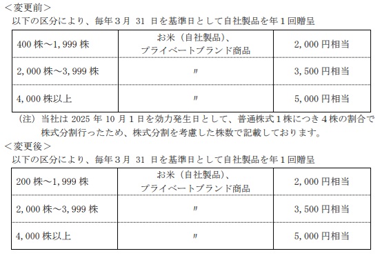 ユアサ・フナショクの株主優待は毎年3月の年1回。分割前400株ではおこめやプライベートブランド商品2,000円相当がもらえていた。今回の変更で、2026年3月は分割後200株でおこめやプライベートブランド商品2,000円相当がもらえる。200株は分割前50株なので、純粋に拡充といえよう。しかも、従来400株を保有していた人は、分割後1,600株になっているわけで、変更後、分割後の400株を買い増せば、3,500円相当の商品がもらえる。