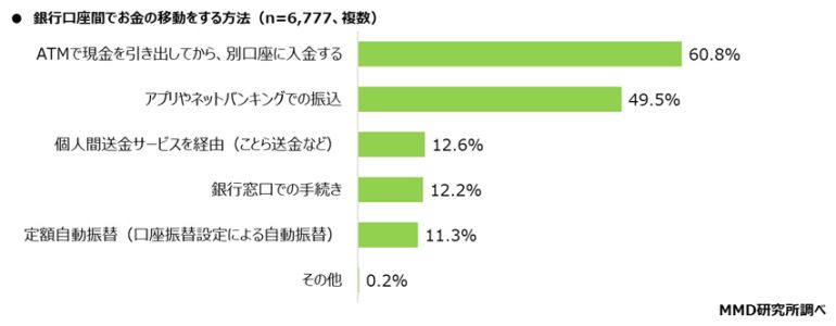 銀行口座間でお金を移動させている人は76.3%、移動方法は「ATMで現金を引き出してから、別口座に入金する」が60.8%で最多