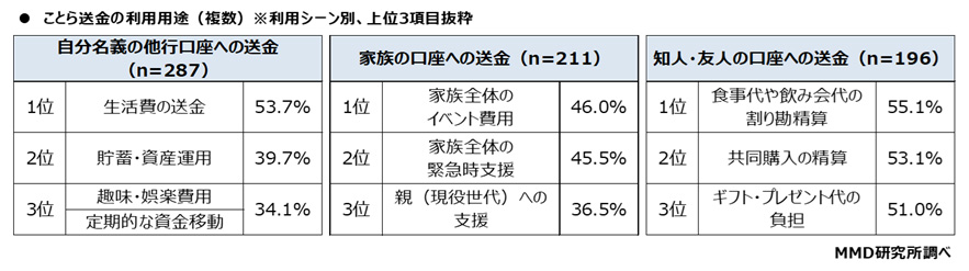 ことら送金の利用シーンごとに利用用途を聞いたところ(複数回答可)、自分名義の他行口座への送金(n=287)は「生活費の送金」が53.7%、家族の口座への送金(n=211)は「家族全体のイベント費用」が46.0%、知人・友人の口座への送金(n=196)は「食事代や飲み会代の割り勘精算」が55.1%とそれぞれ最多となった。