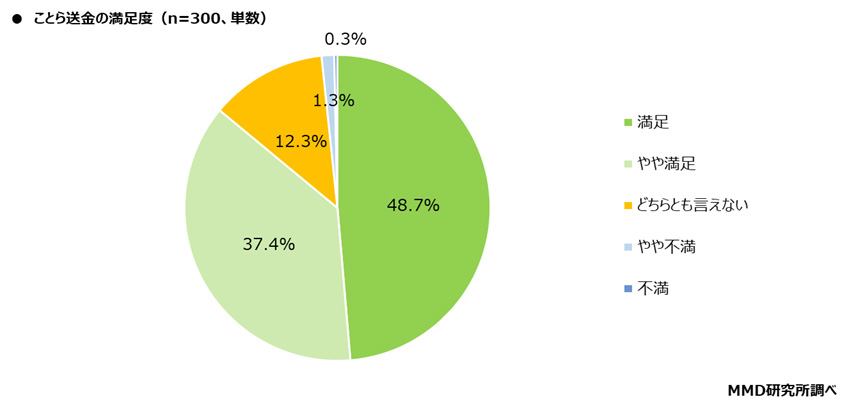 ことら送金利用経験者300人を対象に、ことら送金の満足度を聞いたところ、「満足」が48.7%、「やや満足」が37.3%と合わせて86.0%が満足していることがわかった。