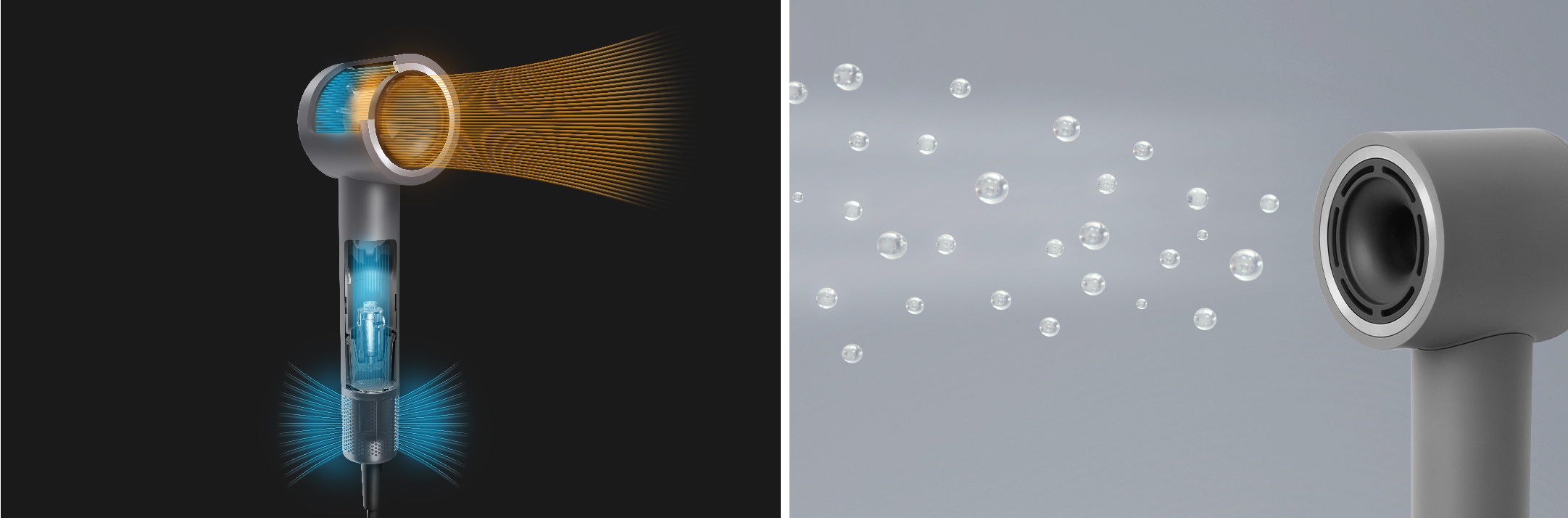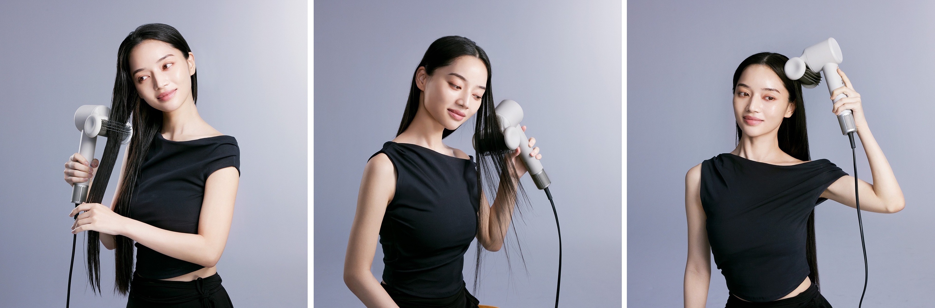 また、高速BLDCモーター採用により、ブランド史上最大風速&風圧を実現しているのも特長で、根元から一気に乾かすことで、超速乾を実現し、髪へのダメージを抑制。さらに、イオン機能も搭載し、3WAYツールを通して髪に近い距離でマイナスイオンを浴びることで髪をコーテイングし、うるおいのあるしっとりまとまり髪へ導く。