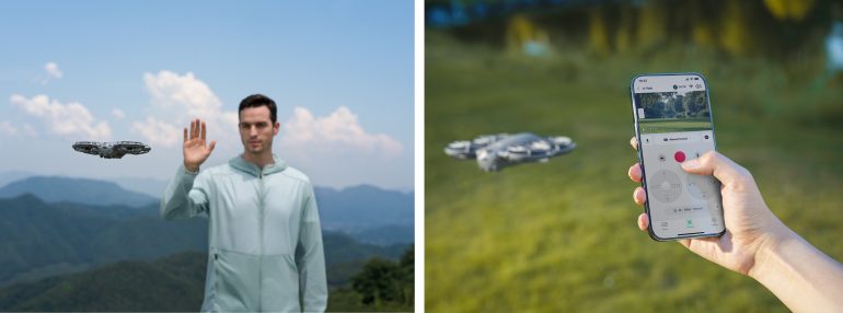 ジェスチャー操作時は、片手または両手でドローンの飛行方向やドローンとの間の距離を簡単に調整可能。手のひらをドローンに向ければ上下左右に誘導でき、両手を使えば距離もコントロールできる。