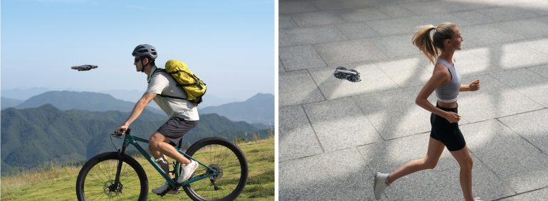 また、前方・後方・左・右、さらに斜め4方向の合計8方向でのトラッキングにより、より自然なフォローショットが可能。さらに、複雑な環境では、ドローンは後方トラッキングモードに切り替わり、被写体をしっかりと捉えながら安定した撮影を実現する。