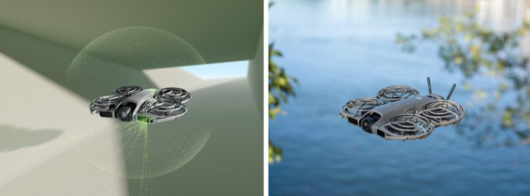 さらに、前モデルNeoと比べてホバリングおよびポジショニングの性能が向上しており、様々な飛行シーンに対応。これにより、屋内や建物の近く、水上や雪上といった複雑な環境でも、より簡単に飛行することができる。