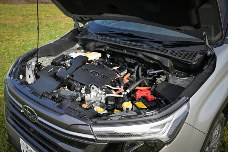 新型フォレスター最大の注目点は、すでにクロストレックに搭載されていたトヨタの2モーターハイブリッドシステム、THSをベースにスバルがAWDとともに組み合わせた2.5L水平対向エンジンによるストロングハイブリッド(エンジン160ps、21.3kg-m。モーター119ps、27.5kg-m)をプレミアムとX-BREAKグレードに採用したことだ。
