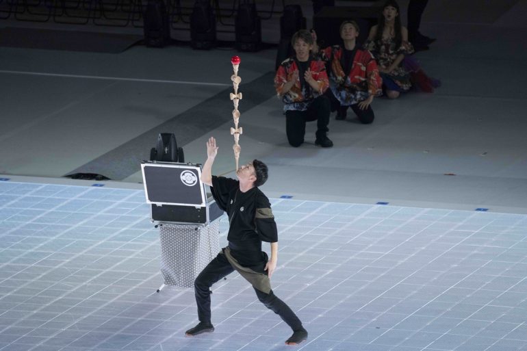 東京都が実施している審査会に合格し、ライセンスを取得し普段は公共施設や民間施設などでその技を披露している「ヘブンアーティスト」に登録しているパフォーマーの面々。日本の伝統芸能を取り入れたさまざまなアクロバティックな表現で、開会式を盛り上げるのに一役買っていた。