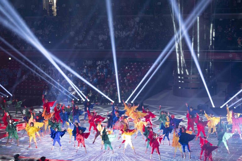 開会式の最後は、アーティスティックプログラム『100年の1日』の披露で締めくくられた。この作品は、きこえない・きこえにくい人ときこえる人、そして大人や子どものさまざまな背景を持つ人々の「共生社会~未来へ」がテーマ。そしてステージ上だけではなく客席にもパフォーマーを配置。選手団や来場者までを巻き込んで、会場全体で一体感のある演出が施されていた。