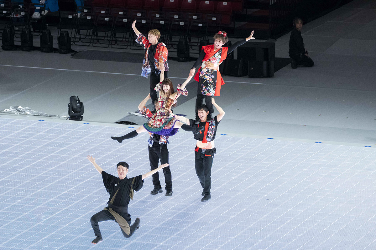 東京都が実施している審査会に合格し、ライセンスを取得し普段は公共施設や民間施設などでその技を披露している「ヘブンアーティスト」に登録しているパフォーマーの面々。日本の伝統芸能を取り入れたさまざまなアクロバティックな表現で、開会式を盛り上げるのに一役買っていた。