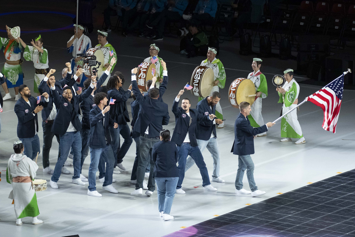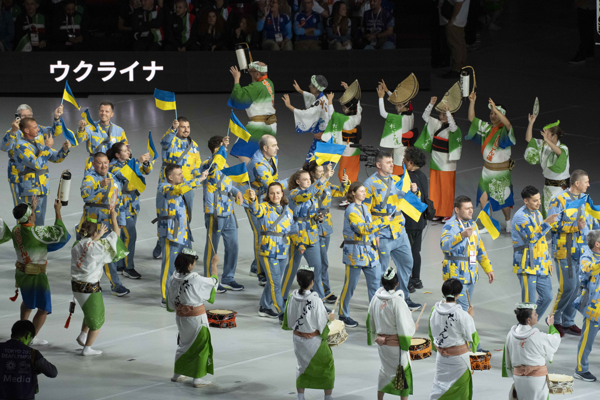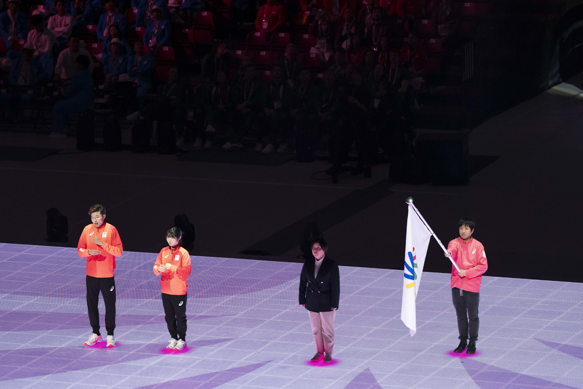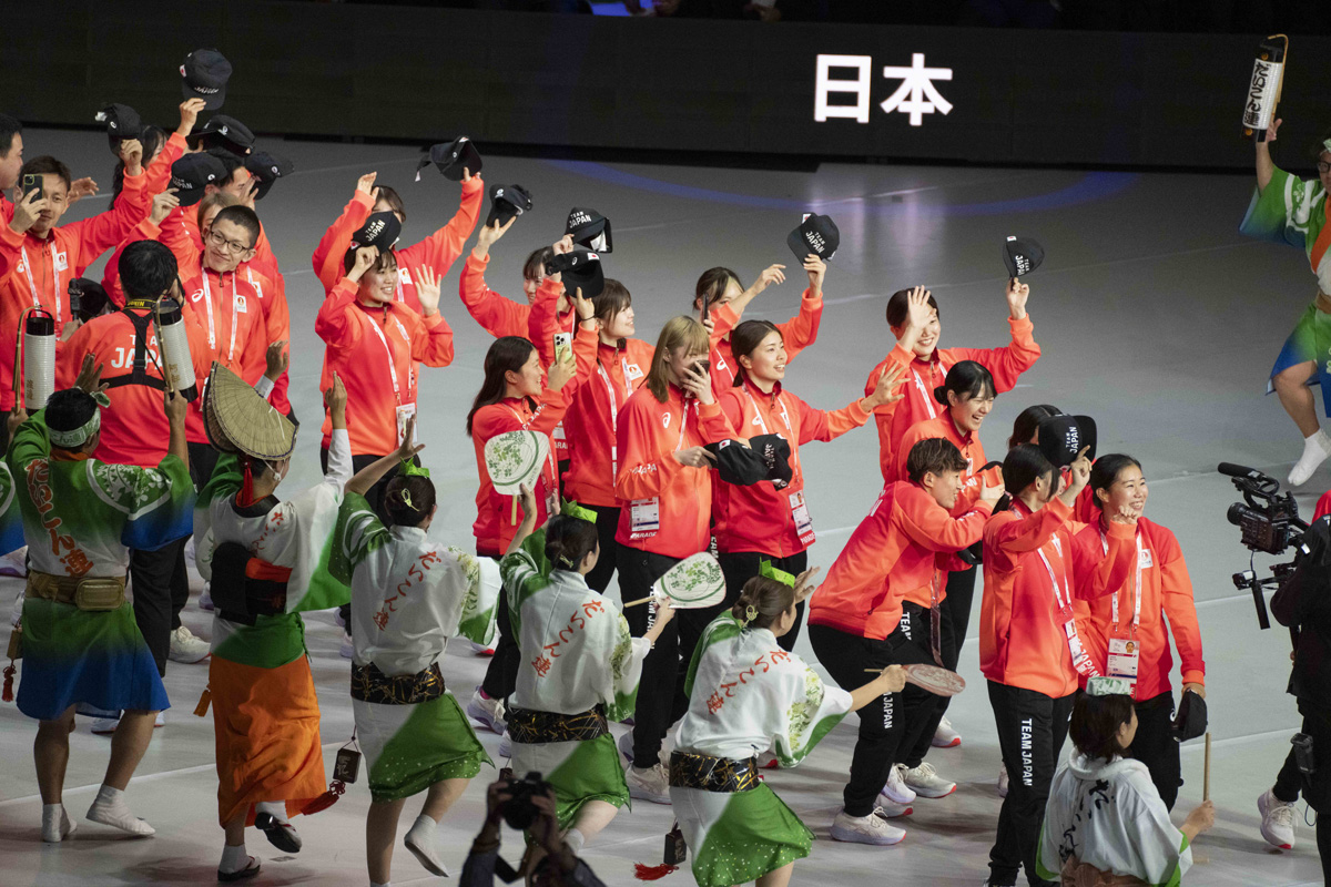 開催国の日本は、旗手の小倉涼選手(空手女子)を先頭に最後に入場。会場内は、両手をひらひらとふる手話言語の拍手と声援で溢れ、盛り上がる。選手たちもそれに手を振って思いっきりの笑顔で応えた。