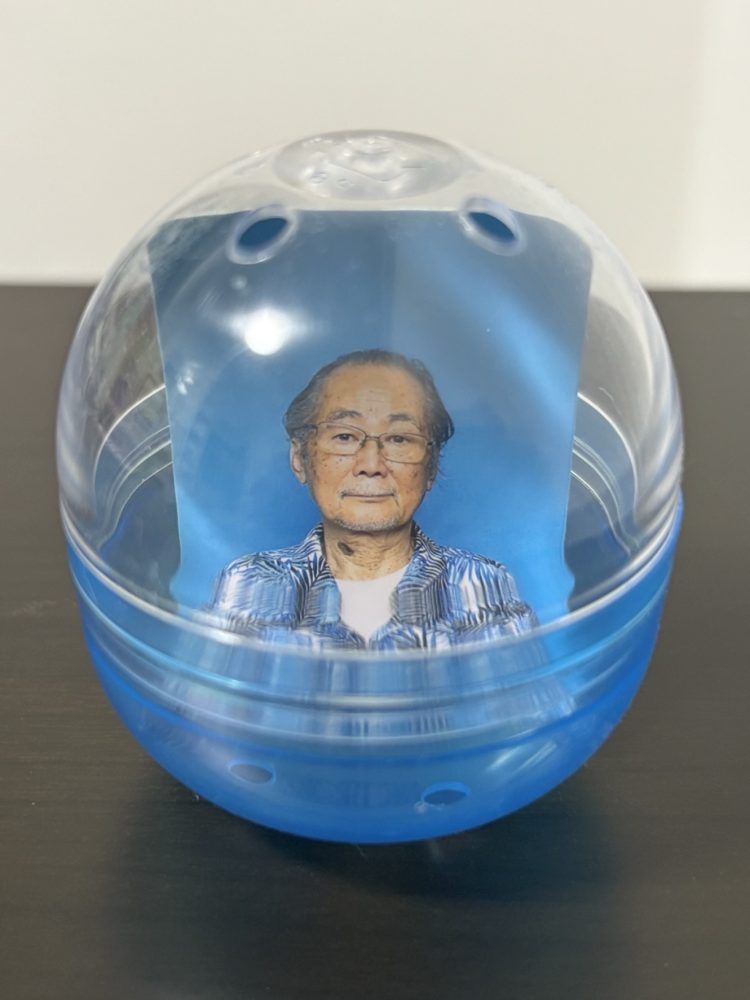 「以前、料理やグルメマンガの第一人者と言われるビッグ錠先生のお宅に伺う機会がありました。その時、棚の上に証明写真を見つけたんです。その写真を一枚、先生にお願いしていただいてきたのですが、証明写真って保管がむずかしい。ハガキ入れにいれたり、写真立てにいれたりしたけれど、何だか収まりが悪い。それで、たまたま手元にあったカプセルトイのカプセルにいれてみたんです」