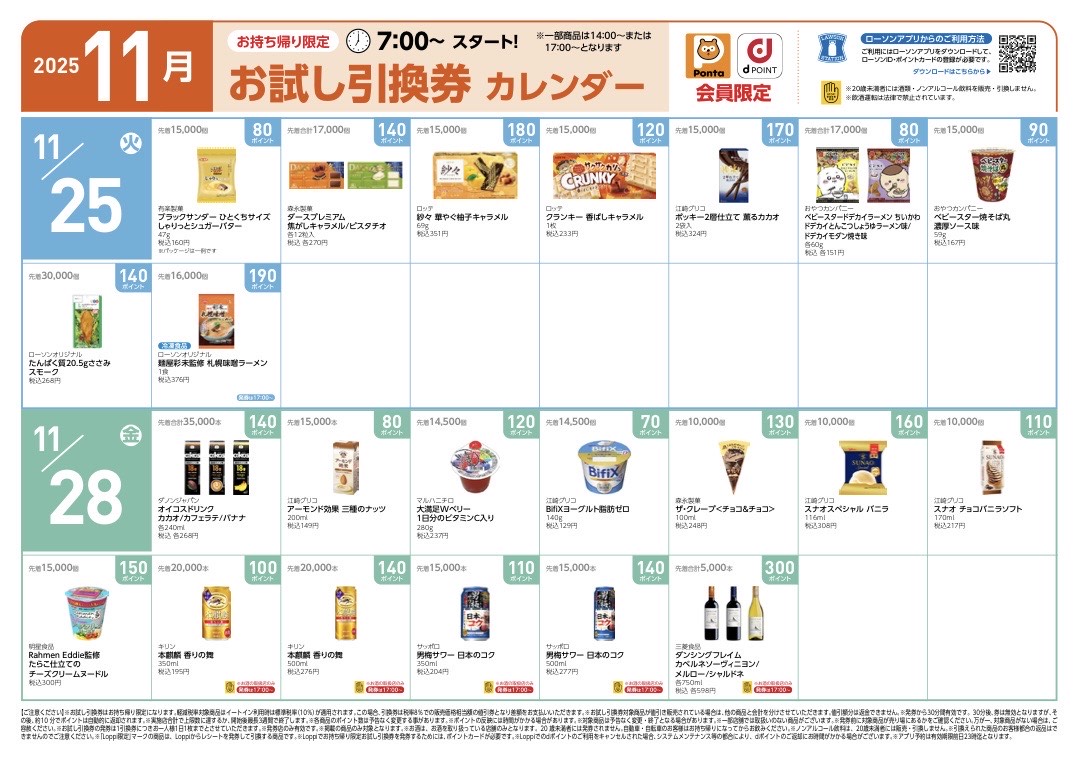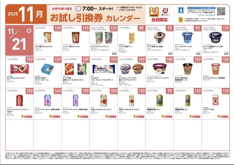 もしお試し引換券の商品の販売価格が200円(税抜)以上だったら、dポイントカードまたはPontaポイントカードを提示すると通常通りポイントが貯まります。なので、ポイントカードの提示をお忘れなく。ちなみにローソンは200円(税抜)につき1ポイント付与が通常で、16時~23時59分の間だとそれが2倍になります。急ぎでなければ夕方以降にローソンで買い物するのがおすすめです。