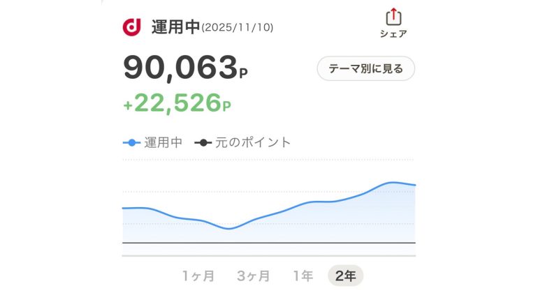 dポイント運用はdポイントで投資ができるサービスで、1ポイントから始めることができ、投資信託の価額に連動してポイントが増減します。証券口座を作ったりなどの手続きはないので始めるのは簡単です。