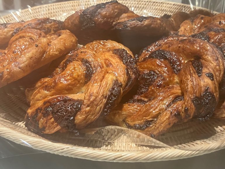 チョコレートクロワッサンをアレンジしたような感じで、外側はザクザク。さすがチョコレート専門店なのでチョコのクオリティも高い。朝に焼きたてが並び、昼過ぎにもう一度焼きたてが並ぶが、いつも夕方には売り切れてしまうほどの人気だとか。