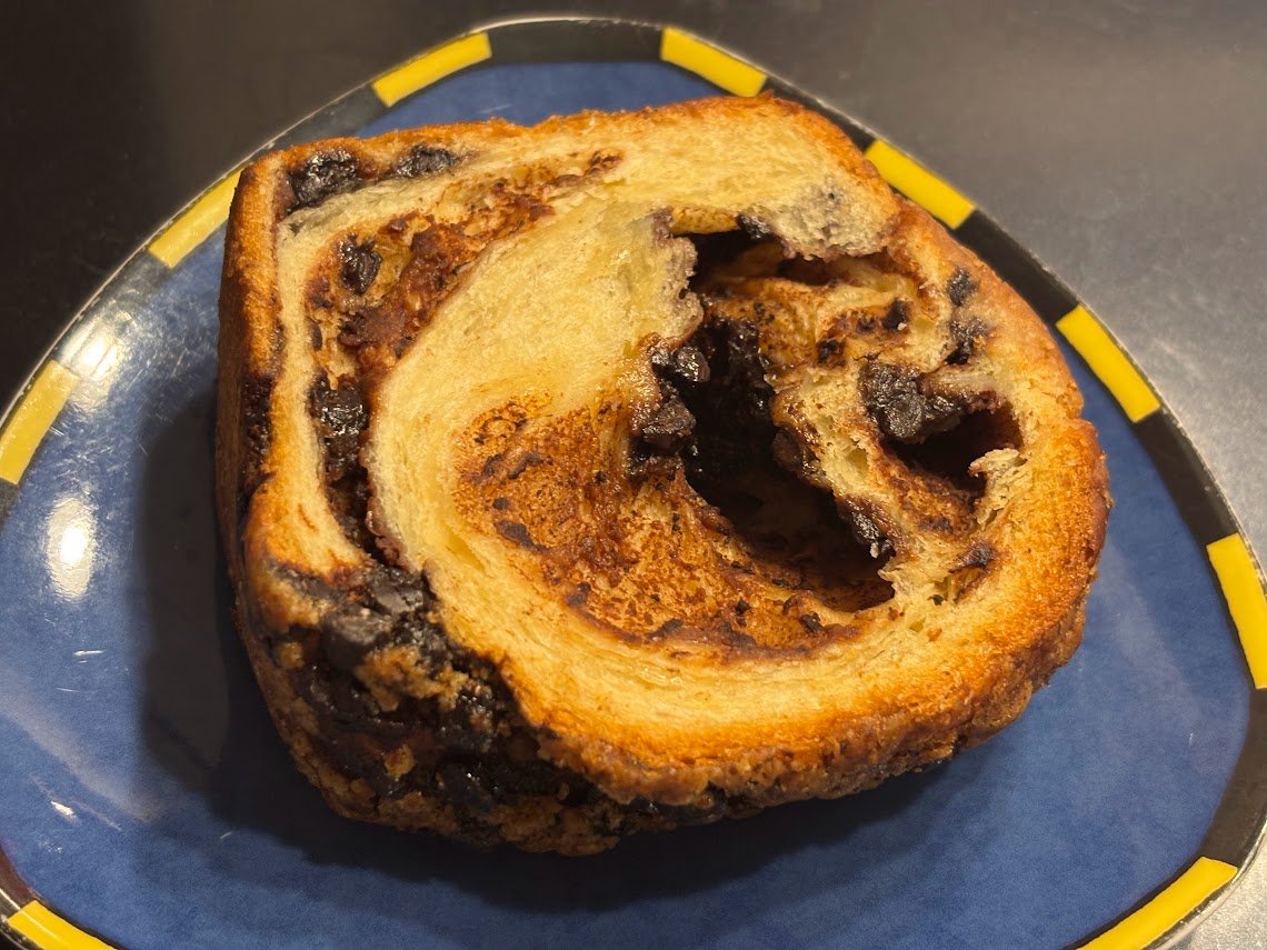 こちらのバブカは、クランブルの食感が効いていて、シナモンの香りが豊か。温めるとシナモンの香りがぷんぷん漂ってくる。チョコレートも少し溶け気味になり、やわらかな食感でもっちりさが強調される。