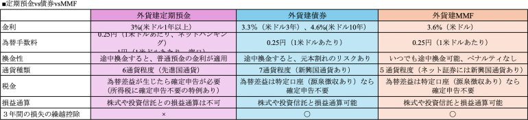 MMFと似た金融商品に外貨定期預金や外貨建債券が挙げられる。