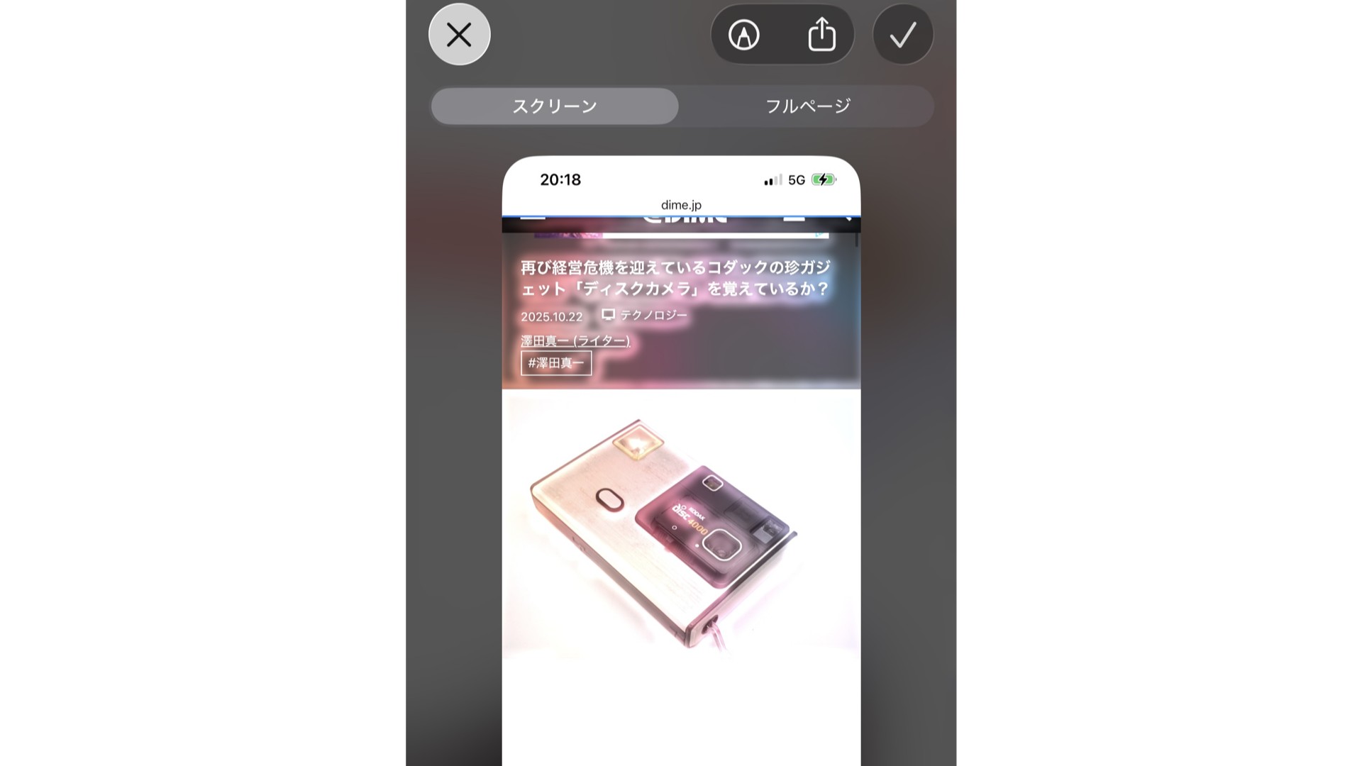 たとえば、筆者が@DIMEで配信した『再び経営危機を迎えているコダックの珍ガジェット「ディスクカメラ」を覚えているか?』という記事の冒頭部分をスクショし、カメラの写真だけを囲って「これが何なのか?」を検索する。そうすることで、この部分だけの画像検索ができるのだ。