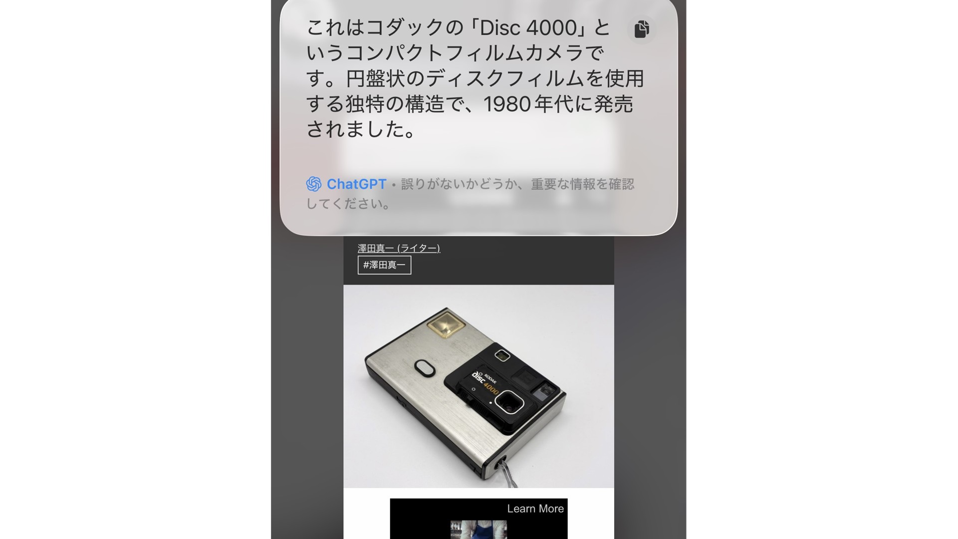 もちろん、「質問」機能で直接「このカメラは何?」と質問するのもアリ。ビジュアルインテリジェンスはChat GPTと連携しているため、その質問にはChat GPTが答えてくれる。