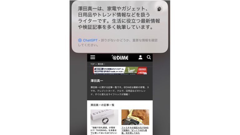 たとえば、@DIMEでは記事の筆者名のハッシュタグが用意され、それをタップするとその筆者の手掛けた記事が一覧表示される。この画面をスクショし、「これらの記事を書いたライターについて教えて」と質問してみる。すると、