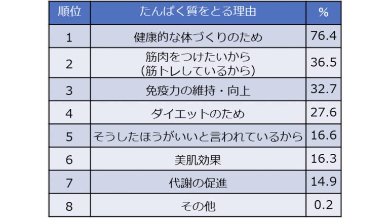 「意識的にたんぱく質をとるようにしている」人を対象に、「なぜたんぱく質をとろうと思いますか?」と聞いた質問では、「健康的な体づくりのため」が76.4%で圧倒的1位であった。