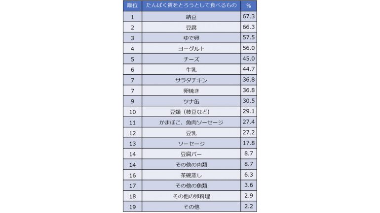 3位は「ゆで卵」(57.5%)で、4位~6位には「ヨーグルト」(56.0%)、「チーズ」(45.0%)、「牛乳」(44.7%)といった乳製品がランクイン。大豆製品や卵、乳製品で日常生活の中に無理せずたんぱく質をとり入れている人が多そうだ。