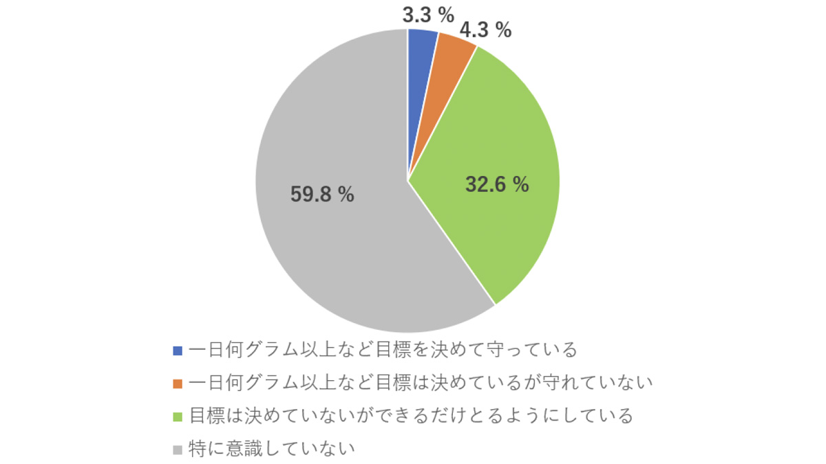 「一日何グラム以上など目標を決めて守っている」割合は3.3%、「一日何グラム以上など目標は決めているが守れていない」は4.3%、「目標は決めていないができるだけとるようにしている」は32.6%で、3つ合わせて「意識的にたんぱく質をとるようにしている」割合は40.2%であった。一方、「特に意識していない」は59.8%という結果に。
