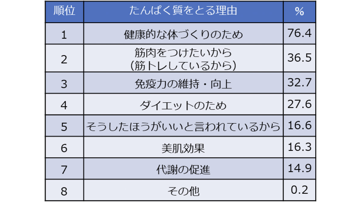2位以下には「筋肉をつけたいから(筋トレしているから)」(36.5%)、「免疫力の維持・向上」(32.7%)、「ダイエットのため」(27.6%)が続いたが、何か特定の効果を求めるだけでなく、「たんぱく質は体に良い」という健康への意識が見られる。