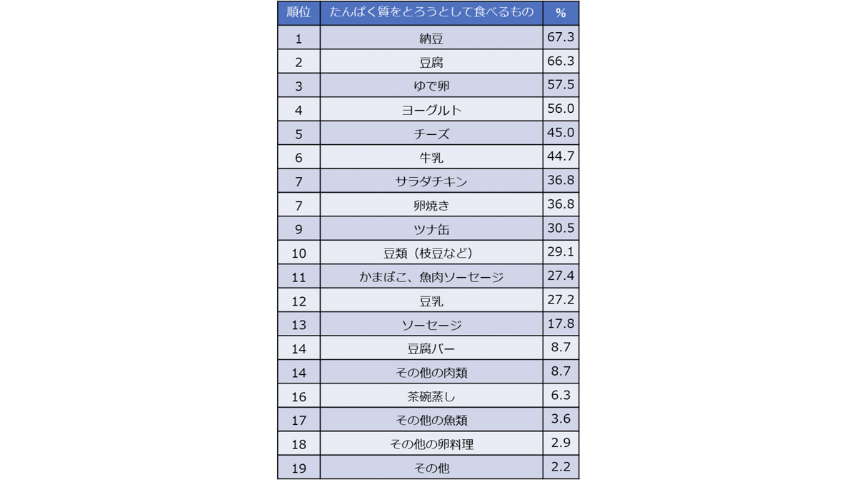 「意識的にたんぱく質をとるようにしている」人を対象に、「食事の中でたんぱく質をとろうとするとき、何を食べようと思いますか?」と聞いた質問では、「納豆」(67.3%)、「豆腐」(66.3%)といった大豆製品が1位・2位に輝いた。