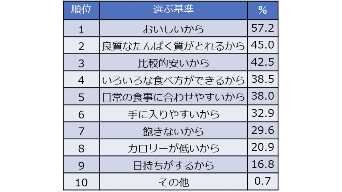 前問(「食事の中でたんぱく質をとろうとするとき、何を食べようと思いますか?」)に続き、「なぜそれを食べようと思いますか?」と聞いた質問では、「おいしいから」(57.2%)が最も多く、「良質なたんぱく質がとれるから」(45.0%)、「比較的安いから」(42.5%)が続いた。